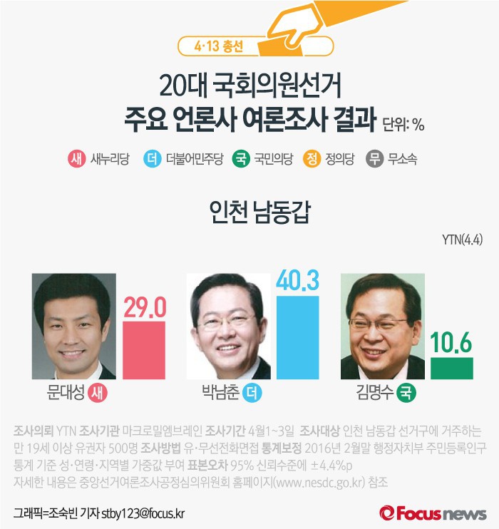 (서울=포커스뉴스) YTN이 마크로밀엠브레인에 의뢰해 4월1일부터 3일까지 인천 남동갑 선거구에 거주하는 유권자 500명을 대상으로 여론조사를 실시한 결과, 더민주 박남춘 후보의 지지율이 40.3%을 기록했고 새누리당 문대성 후보(29.0%), 국민의당 김명수 후보(10.6%)가 그 뒤를 따르는 것으로 나타났다.