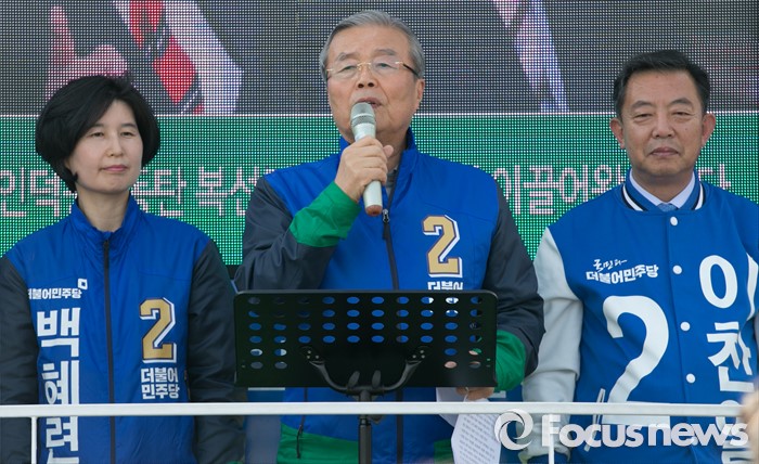 (수원=포커스뉴스) 4일 오후 경기도 지하철 1호선 성균관대역 앞에서 열린 더불어민주당 수원지역 합동유세에 참석한 김종인(가운데) 비대위 대표 겸 선대위원장이 이찬열(오른쪽) 수원갑, 백혜련 수원을 후보의 지지를 호소하고 있다.