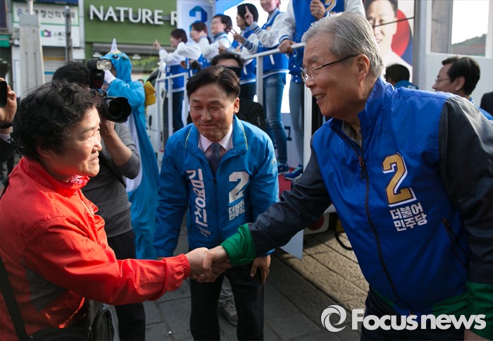 (수원=포커스뉴스) 4일 오후 경기도 수원 팔달문시장 앞에서 열린 더불어민주당 수원지역 합동유세에 참석한 김종인 비대위 대표 겸 선대위원장이 시민들과 인사하며 지지를 호소하고 있다.