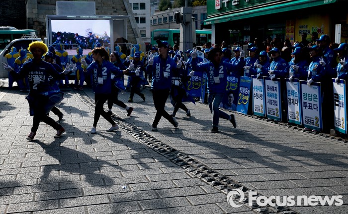 (수원=포커스뉴스) 4일 오후 경기도 수원 팔달문시장 앞에서 열린 더불어민주당 수원지역 합동유세에 참여한 김영진 수원병 후보의 유세단원들이 율동을 선보이고 있다.