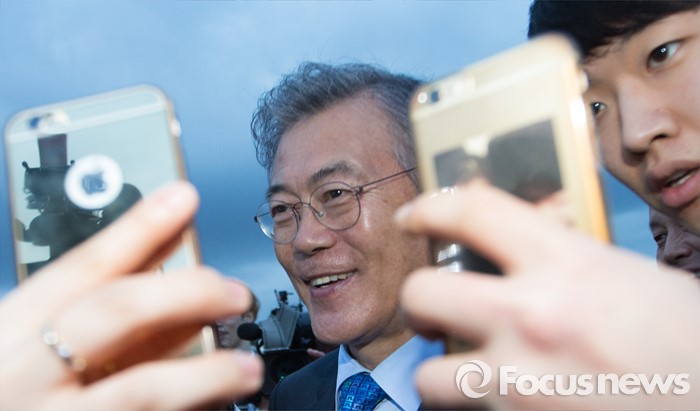 (청주=포커스뉴스) 문재인 더불어민주당 전 대표가 4일 오후 충북 청주 무심천인라인스케이트장에서 시민들과 셀카를 찍고 있다.
