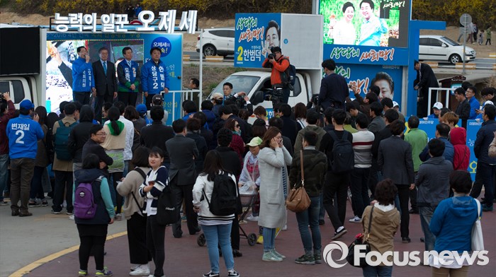 (청주=포커스뉴스) 4일 오후 충북 청주 무심천인라인스케이트장에서 오제세 후보가 시민들에게 지지를 호소하고 있다.