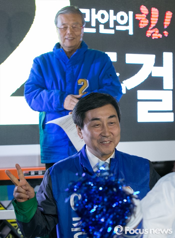 (안양=포커스뉴스) 4일 오후 경기도 지하철 1호선 안양역 앞 광장에 김종인(뒤) 더불어민주당 비대위 대표 겸 선대위원장이 안양 만안구 후보인 이종걸 원내대표의 선거율동을 추는 모습을 바라보고 있다.