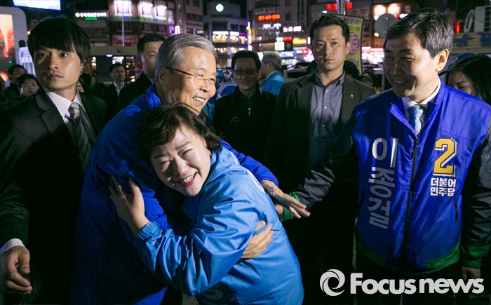 (안양=포커스뉴스) 4일 오후 경기도 지하철 1호선 안양역 앞 광장에서 선거유세를 마친 김종인(왼쪽) 더불어민주당 비대위 대표 겸 선대위원장이 안양 만안구 후보인 이종걸(오른쪽) 원내대표의 지지자들과 포옹을 하고 있다.