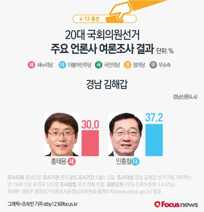 (서울=포커스뉴스) 경남신문이 여론조사기관 한국갤럽에 의뢰해 4일 발표한 여론조사 결과에 따르면 민홍철 후보가 37.2%의 지지율을 기록해 홍태용 의원(30.0%)보다 7.2%p 높았다.
