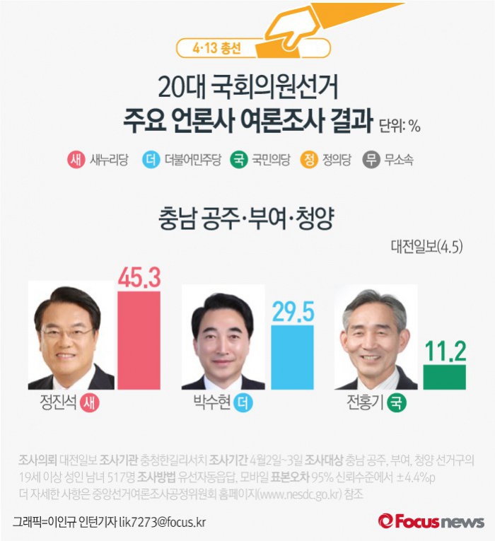 (서울=포커스뉴스) 대전일보가 여론조사기관 충청한길리서치에 의뢰해 5일 발표한 결과에 따르면새누리당 정진석 후보 45.3%,더불어민주당 박수현 의원29.5%, 국민의당 전홍기 후보 11.2%를 기록 했다.
