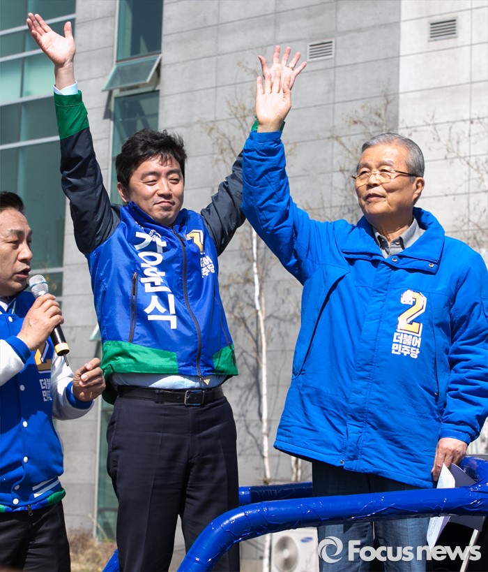 (아산=포커스뉴스) 5일 오전 충남 아산시 배방읍사무소 앞 사거리에서 김종인(오른쪽) 더불어민주당 비대위 대표 겸 선대위원장이 강훈식 아산을 후보와 손을 들어 인사하고 있다.