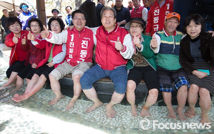 (대전=포커스뉴스) 김무성 새누리당 대표가 5일 오전 대전 유성구 족욕체험장에서 족욕을 하며 진동규 후보의 지지를 호소하고 있다.