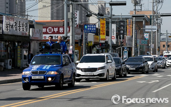 (아산=포커스뉴스) 5일 오전 충남 아산시 배방읍사무소 앞 인근 거리에서 김종인(오른쪽) 더불어민주당 비대위 대표 겸 선대위원장과 강훈식 아산을 후보가 유세를 마친 뒤 차량에 올라 지지를 호소하고 있다.