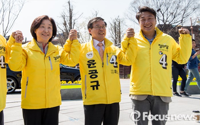 (서울=포커스뉴스) 5일 오전 서울 종로구 성균관대학교 정문 앞에서 윤공규 종로구 후보 지원유세에 나선 심상정(왼쪽부터) 정의당 상임선거대책위원장이 윤 후보, 조성주 비례후보와 포즈를 취하고 있다.