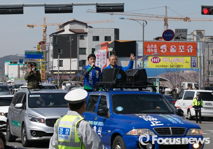 | △ 유세차량 올라 지지 호소하는 김종인-강훈식 |