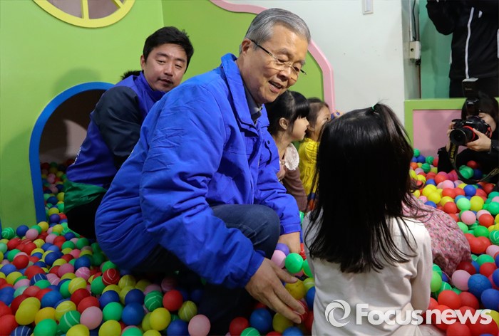 (아산=포커스뉴스) 김종인(가운데) 더불어민주당 비대위 대표 겸 선대위원장과 강훈식(왼쪽) 충남 아산을 후보가 5일 오전 충남 아산시 진성어린이집을 방문해 어린이들과 볼풀장에서 즐거운 시간을 보내고 있다.