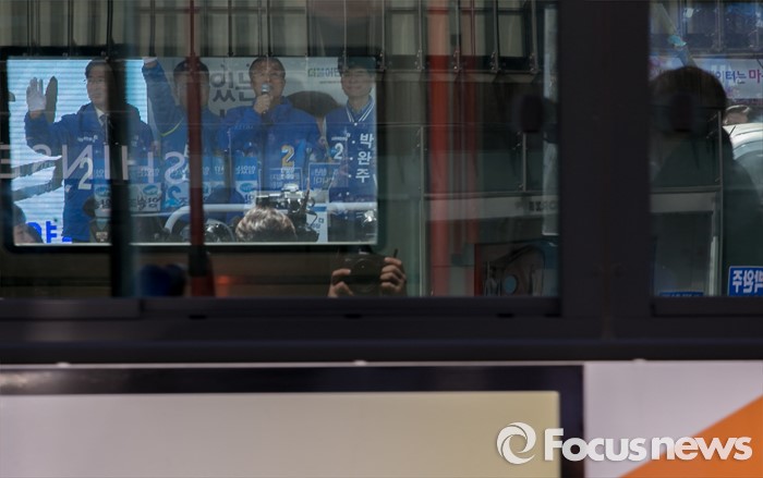 | △ 버스 통해 보이는 더민주 천안유세 |