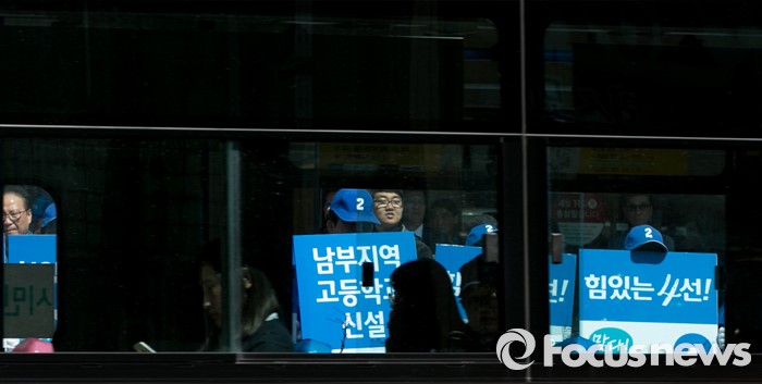 (천안=포커스뉴스) 5일 오전 충남 천안시 신세계백화점 앞에서 열린 더불어민주당 천안지역 합동유세에 참여한 선거운동원들이 지지를 호소하고 있다.