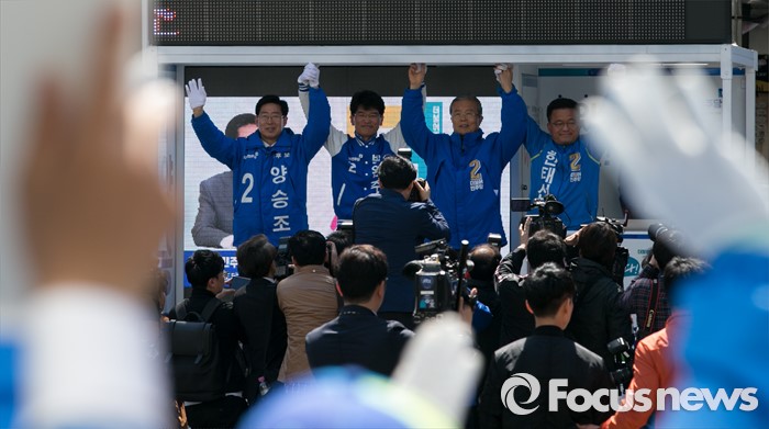 (천안=포커스뉴스) 5일 오전 충남 천안시 신세계백화점 앞에서 열린 더불어민주당 천안지역 합동유세에 참석한 김종인 비대위 대표 겸 선대위원장과 후보들이 지지를 호소하고 있다. 왼쪽부터 양승조 천안병, 박완주 천안을 후보, 김 대표, 한태선 천안갑 후보.