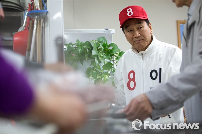 (서울=포커스뉴스) 은평을 무소속 이재오 후보가 5일 오전 서울 은평구 불광노인복지관에서 어르신들에게 점심배식을 하며 유세를 하고 있다.