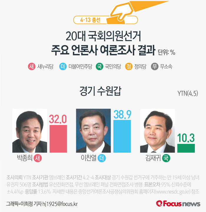 (서울=포커스뉴스) YTN이 엠브레인에 의뢰해 5일 발표한 여론조사 결과에 따르면 새누리당 박종희 후보의 지지율은 32.0%, 더불어민주당 이찬열 후보는 38.9%, 국민의당 김재귀 후보는 10.3%를 기록했다.