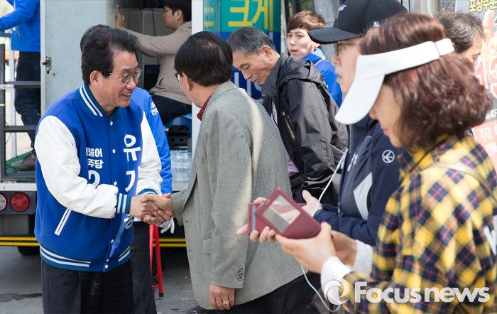 (서울=포커스뉴스) 5일 오후 서울 관악구 서울대입구역 인근에서 유기홍 더불어민주당 관악구갑 후보가 선거유세를 하고 있다.