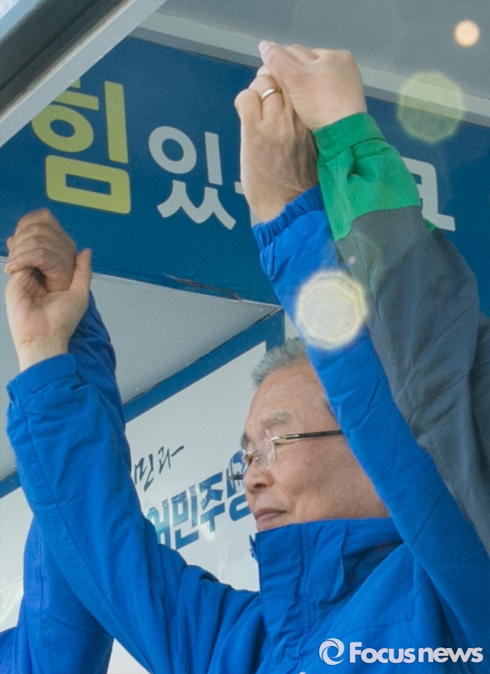 (평택=포커스뉴스) 5일 오후 경기도 평택역 앞 광장에서 열린 더불어민주당 평택지역 합동유세에 참석한 김종인 비대위 대표 겸 선대위원장이 후보들과 손을 들어 포즈를 취하고 있다.