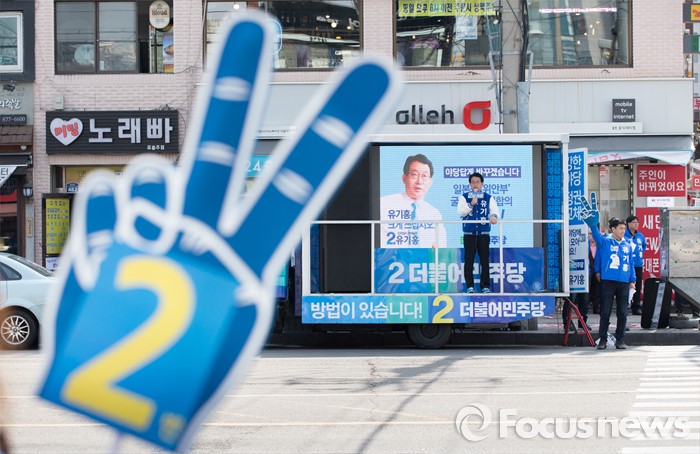 (서울=포커스뉴스) 5일 오후 서울 관악구 서울대입구역 인근에서 유기홍 더불어민주당 관악구갑 후보가 선거유세를 하고 있다.