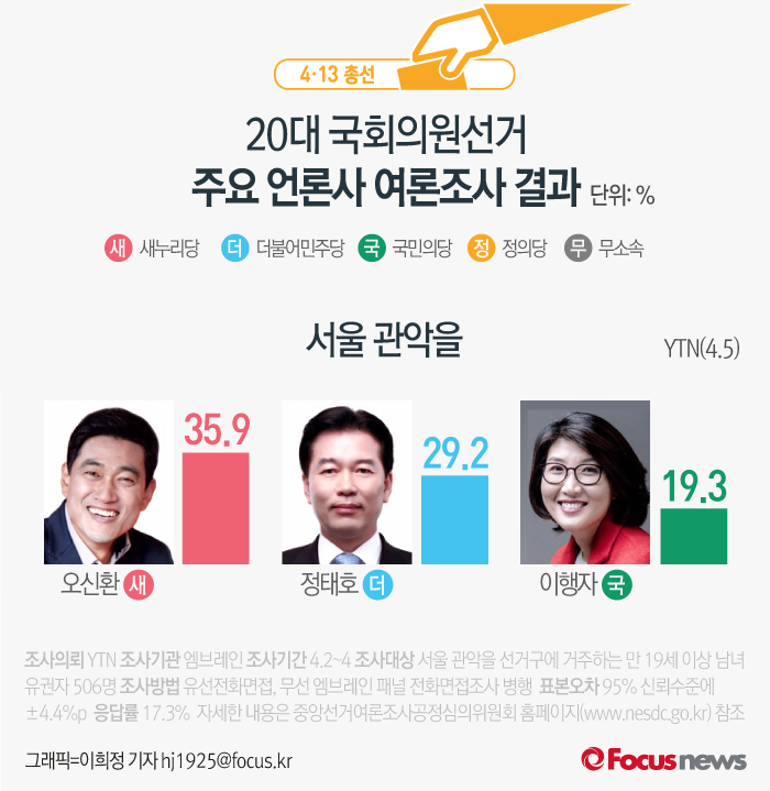 (서울=포커스뉴스) YTN이 엠브레인에 의뢰해 5일 발표한 여론조사 결과에 따르면 새누리당 오신환 후보의 지지율은 35.9%, 더불어민주당 정태호 후보는 29.2%, 국민의당 이행자 후보는 19.3%를 기록했다.
