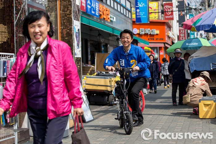 (서울=포커스뉴스) 김영호 더불어민주당 서대문을 후보가 5일 오후 서울 서대문구 백련시장 일대에서 자전거를 타고 주민들을 만나며 한 표를 호소 하고 있다.