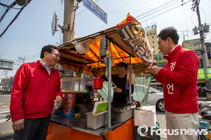 (서울=포커스뉴스) 정두언 새누리당 서대문을 후보가 5일 오후 서울 서대문구 백련시장 일대에서 주민들을 만나며 한 표를 호소 하고 있다.