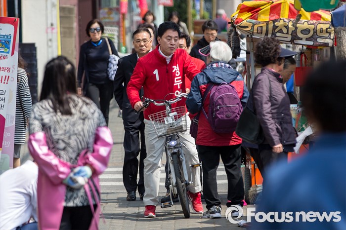 (서울=포커스뉴스) 정두언 새누리당 서대문을 후보가 5일 오후 서울 서대문구 백련시장 일대에서 자전거를 타고 주민들을 만나며 한 표를 호소 하고 있다.