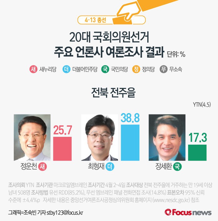 (서울=포커스뉴스) YTN이 여론조사기관 엠브레인에 의뢰해 5일 발표한 결과에 따르면 전북 전주을의 후보지지도는 새누리당 정운천 후보(25.7%), 더민주 최형재 후보(38.8%), 국민의당 장세환 후보(17.3%) 순인 것으로 조사됐다.