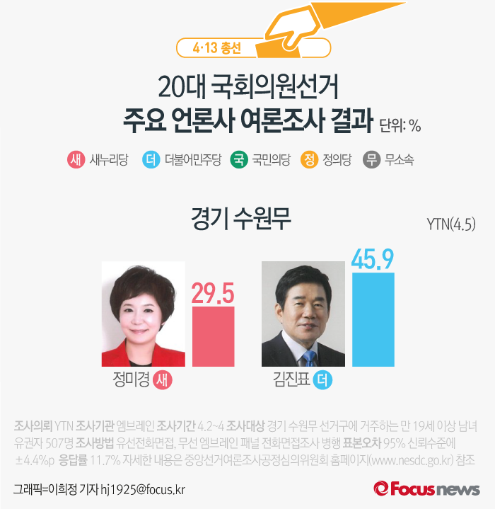 (서울=포커스뉴스) YTN이 엠브레인에 의뢰해 5일 발표한 여론조사 결과에 따르면 새누리당 정미경 후보의 지지율은 29.5%, 더불어민주당 김진표 후보는 45.9%를 기록했다.