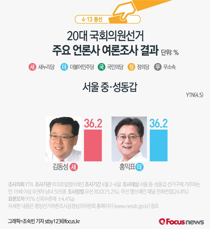 (서울=포커스뉴스) YTN이 여론조사기관 엠브레인에 의뢰해 5일 발표한 결과에 따르면 서울 중·성동갑 선거구에서 새누리당 김동성, 더민주 홍익표 후보 모두 36.2%의 지지율을 얻고 있는 것으로 나타났다.