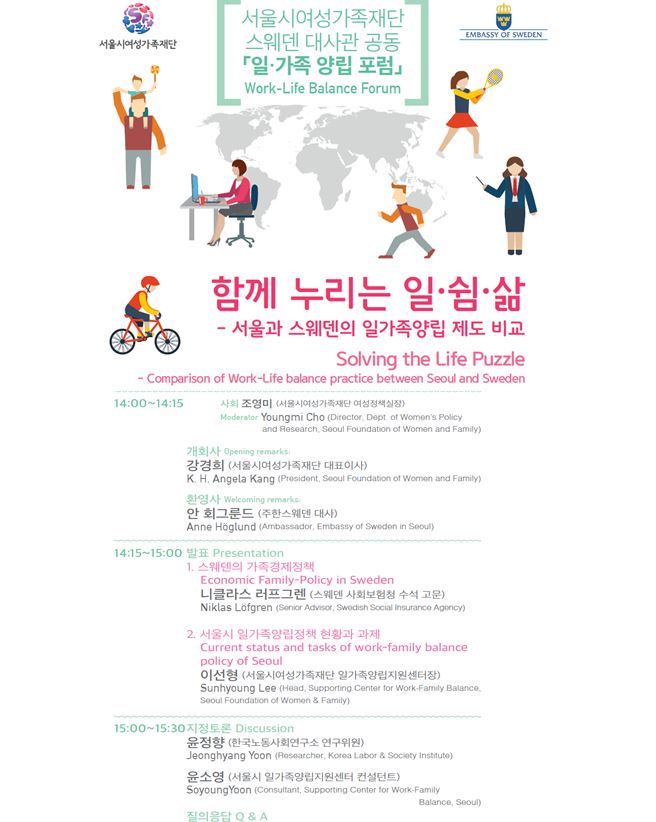 포럼에서는 스웨덴의 일‧가족 양립 정책을 공유하고 서울시 일‧가족 양립 정책의 현황과 발전과제, 정착방안 등에 대해 논의할 계획이다.