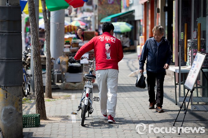 (서울=포커스뉴스) 정두언 새누리당 서대문을 후보가 5일 오후 서울 서대문구 백련시장 일대에서 자전거를 타고 주민들을 만나며 한 표를 호소 하고 있다.