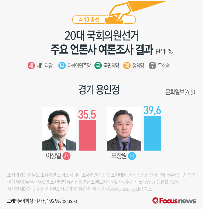 문화일보가 여론조사기관 포커스컴퍼니에 의뢰해 5일 발표한 결과에 따르면 경기 용인정 후보지지도는 표창원 후보, 이상일 후보, 국민의당 김종희 후보 순으로 나타났다.