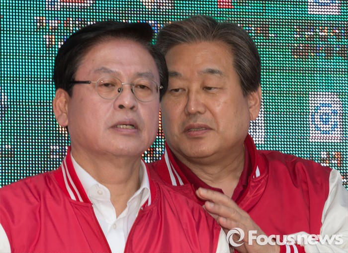 (청주=포커스뉴스) 김무성 새누리당 대표가 5일 오후 충북 청주 성안길에서 정우택 후보와 귀엣말을 나누고 있다.