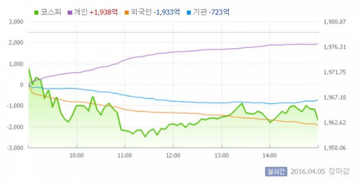 이날 코스피는 전일 대비 0.33% 내린 1972.38로 장을 시작했다. 이후 지수는 낙폭을 확대하며 1970선 마저 붕괴됐다.