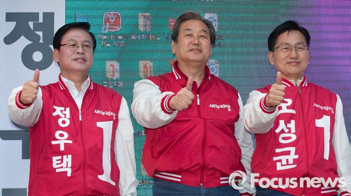 (청주=포커스뉴스) 김무성 새누리당 대표가 5일 오후 충북 청주 성안길에서 정우택, 최현호, 오성균 후보의 지지를 호소하고 있다.