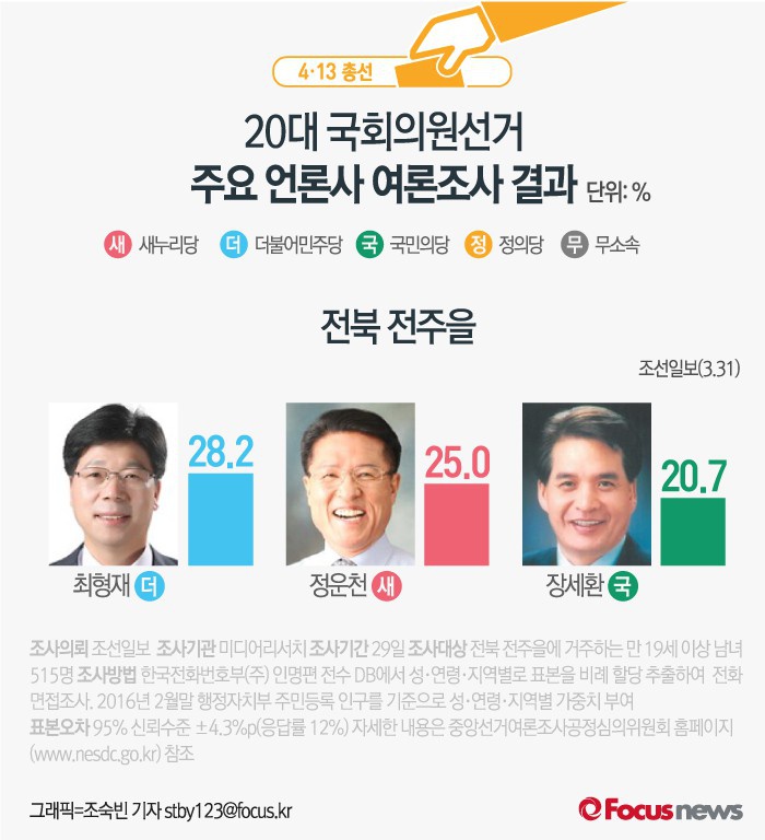 이번 여론조사에 대한 자세한 내용은 중앙선거여론조사공정심의위원회 홈페이지(www.nesdc.go.kr)에서 찾아볼 수 있다.(서울=포커스뉴스) 31일 조선일보는 미디어리서치에 의뢰해 29일 하루동안 전북 전주을 유권자를 대상으로 여론조사를 한 결과, 더민주 최형재 후보의 지지율은 28.2%, 새누리당 정운천 후보의 지지율은 25.0%이라고 밝혔다. 국민의당 장세환 후보는 20.7%의 지지율을 보였다. 2016.03.31 조숙빈 기자