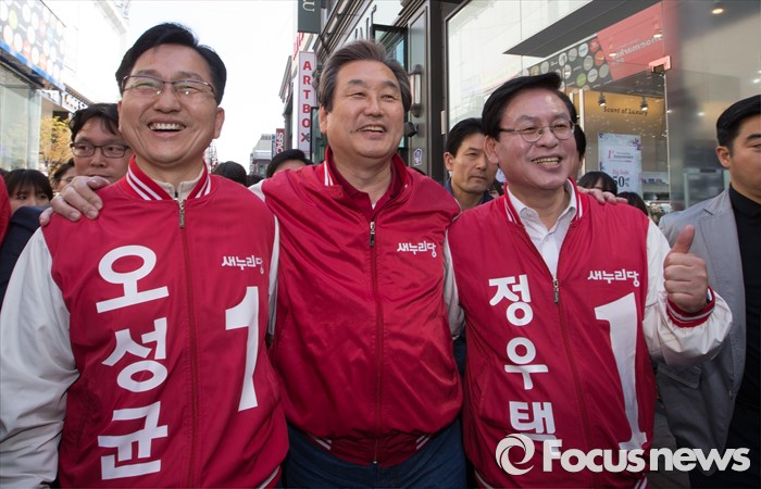 (청주=포커스뉴스) 김무성 새누리당 대표가 5일 오후 충북 청주 성안길에서 정우택, 최현호, 오성균 후보의 지지를 호소하고 있다.