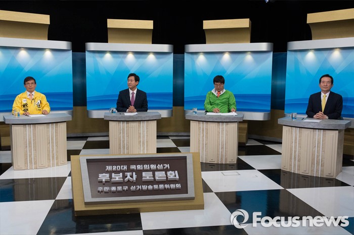 (서울=포커스뉴스) 20대 총선을 8일 앞둔 5일 오후 서울 강서구의 한 지역방송 토론회에 참석한 종로구 후보들이 방송준비를 하고 있다. 왼쪽부터 윤공규 정의당, 오세훈 새누리당, 박태순 국민의당, 정세균 더불어민주당 후보