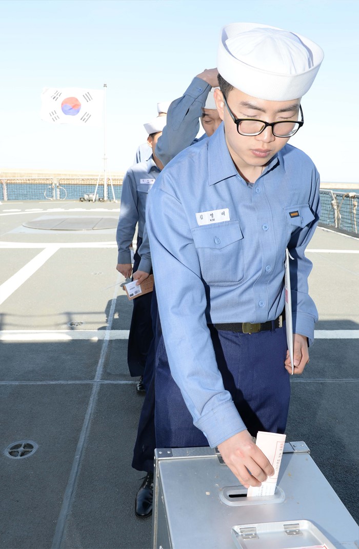 (서울=포커스뉴스) 해군 1함대 광개토대왕함 장병들이 5일 오후 KD-I 광개토대왕함 함미갑판에서 거소투표를 하고 있다. <사진제공=해군>