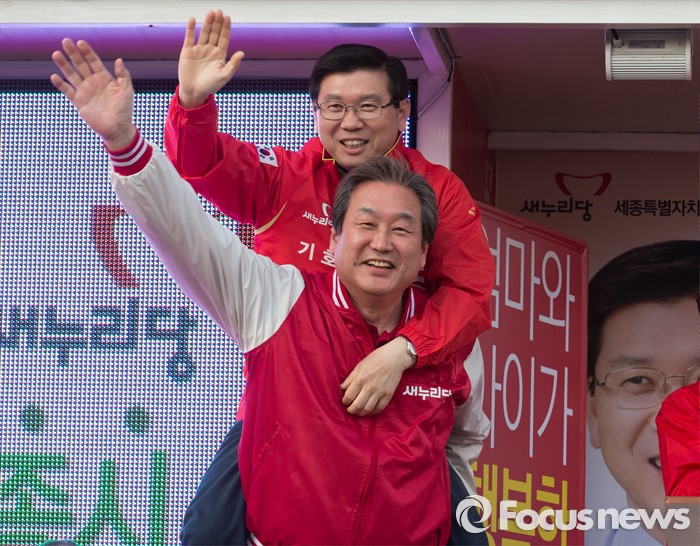 (세종=포커스뉴스) 김무성 새누리당 대표가 5일 오후 세종시 조치원읍 조치원역 앞 교차로에서 박종준 후보를 등에 업고 지지를 호소하고 있다.