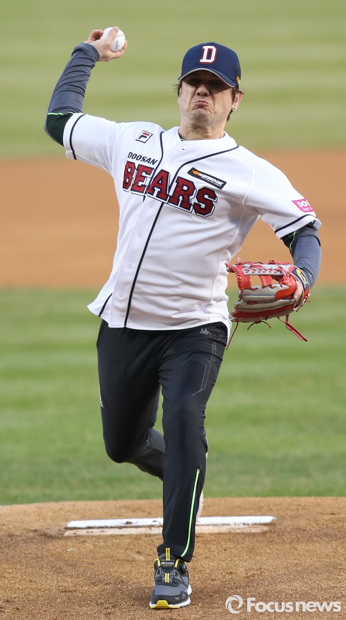 (서울=포커스뉴스) 5일 서울 잠실구장에서 열린 2016프로야구 NC-두산 잠실 개막 경기에서 'She's gone.'을 부른 가수 밀젠코 마티예비치가 시구하고 있다.
