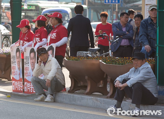 (세종=포커스뉴스) 5일 오후 세종시 조치원읍 조치원역 앞 교차로에서 시민들이 김무성 새누리당 대표의 유세를 바라보고 있다.