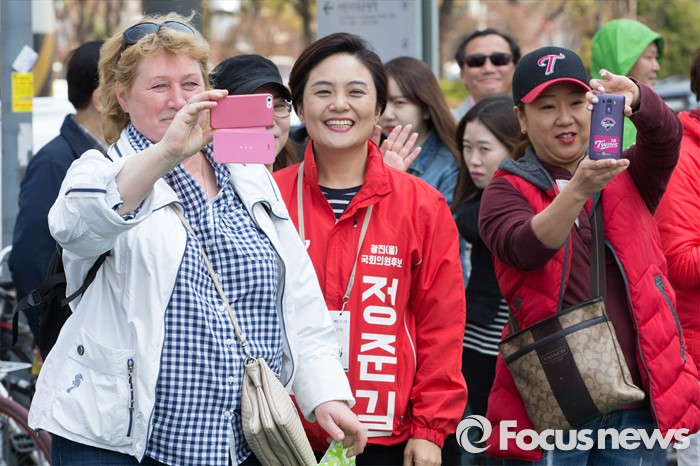 (서울=포커스뉴스) 20대 총선에 출마한 정준길 새누리당 광진을 후보가 5일 오후 서울 건대입구역 인근에서 유권자들에게 지지를 호소하던 중 한 외국인이 유세중인 모습을 스마트폰으로 촬영하고 있다.