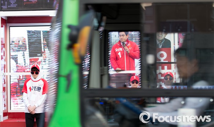 (서울=포커스뉴스) 5일 오후 서울 관악구 김한의원 앞에서 오신환 새누리당 관악구을 후보가 선거유세를 하고 있다.