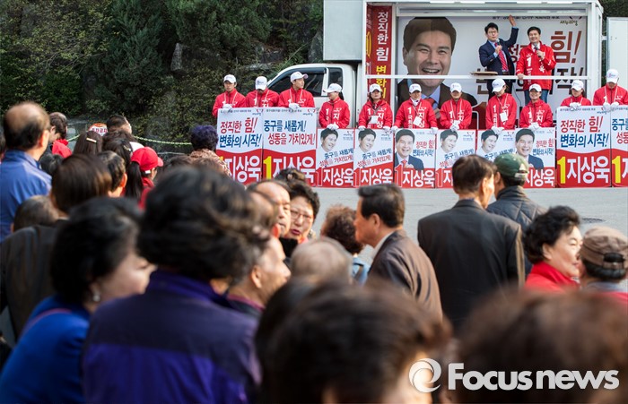 (서울=포커스뉴스) 5일 오후 서울 중구 약수시장 인근에서 지원유세를 가진 지상욱 새누리당 중구성동구을 후보가 유권자들에게 지지를 호소하고 있다.