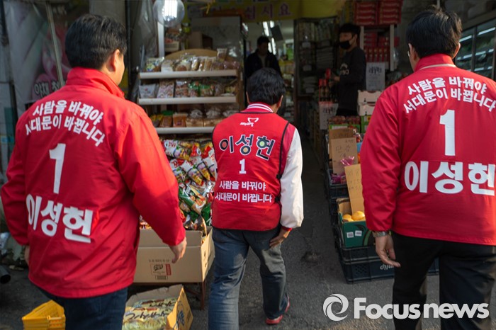 (서울=포커스뉴스) 5일 오후 서울 서대문구 충현동 인근에서 새누리당 서대문갑 이성헌 후보가 거리유세를 하고 있다.