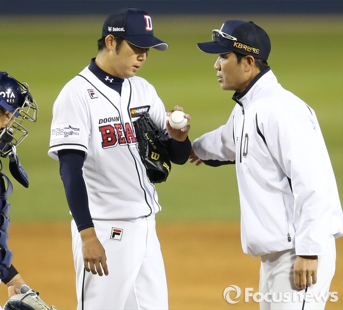 (서울=포커스뉴스) 5일 서울 잠실구장에서 열린 2016프로야구 NC-두산 경기 4회초 2사후 두산 투수 장원준이 3연속 볼넷을 내주자 한용덕 투수코치가 마운드에 올라가 안정시키고 있다.