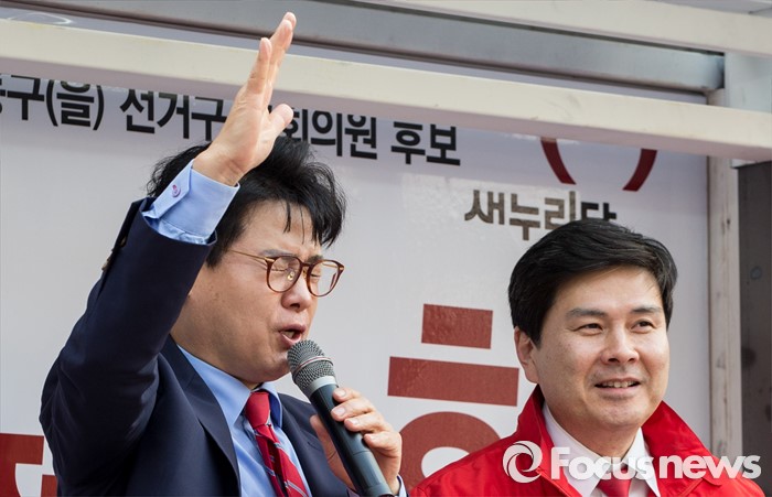 (서울=포커스뉴스) 5일 오후 서울 중구 약수시장 인근에서 열린 지상욱 새누리당 중구성동구을 후보 선거유세에서 김병찬 아나운서가 유권자들에게 지 후보를 향한 지지를 호소하고 있다.